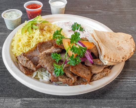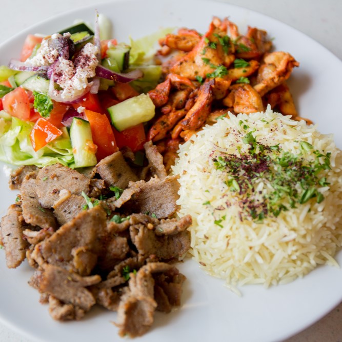 Platter is built with greek salad, hummus, saffron rice and pita bread. Pick any 2 meats for a combo entree.